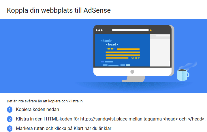 Efter jag skapat ett konto på Google adsense och godkänt villkoren dyker detta upp:
