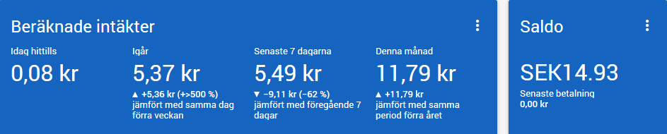 2017-07-21 aktiverade jag Adsense på min site i test och utvärderingssyfte. Hittills har jag alltså tjänat nästan 15 kr, varav denna månad 12 kr! Eftersom jag är lite halvekonom i botten blir jag ju tvungen att damma av kalkylatorn och räkna lite!